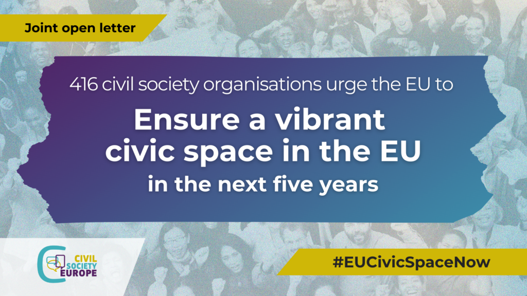 Met het oog op het komende vijfjarige mandaat roepen wij u, samen met 415 maatschappelijke organisaties - uit 26 lidstaten en 4 kandidaat-lidstaten - die zich inzetten voor de bevordering van democratie, mensenrechten en burgerbetrokkenheid in heel Europa, op om prioriteit te geven aan maatregelen die een levendige burgerlijke ruimte bevorderen, de democratie handhaven en de grondrechten waarborgen.